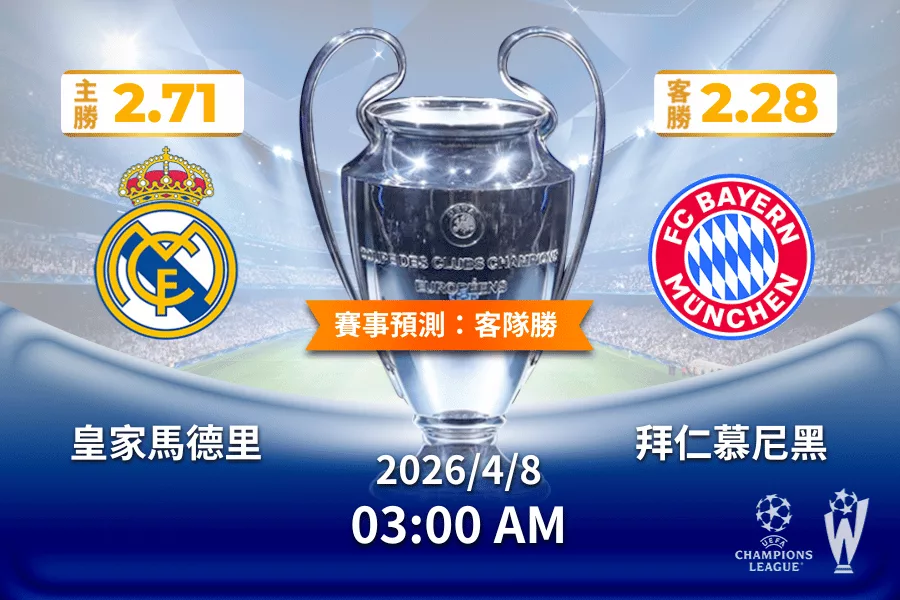 綜合分析兩隊實力對比、近期狀態和賽事性質,這場歐冠八強是本賽季最難以判斷勝負、但最容易判斷進球走向的頂級對決。拜仁慕尼黑客勝賠率2.35略低於皇馬主勝2.75,說明市場整體略偏向客隊;然而平手盤0盤拜仁受讓賠率1.74是讓球市場最低選項,反映客隊在1球差以內不落敗的機率相當高。